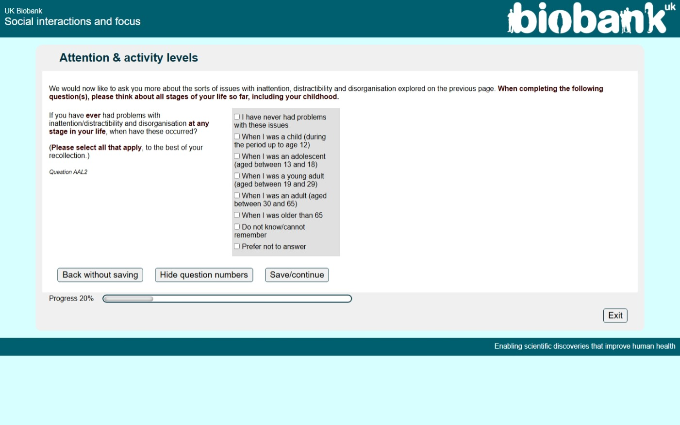 Online Social Interactions and Focus questionnaire screenshot AAL2, showing appearance as seen by participants circa 2023