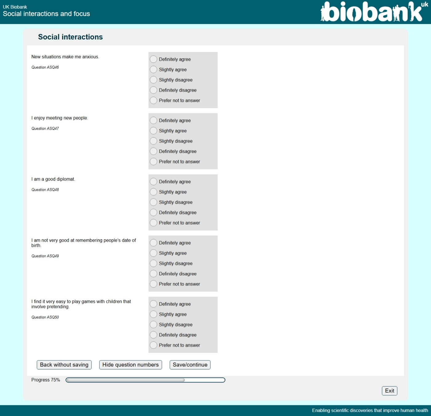 Online Social Interactions and Focus questionnaire screenshot ASQ46, showing appearance as seen by participants circa 2023